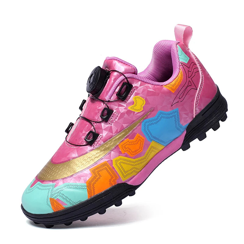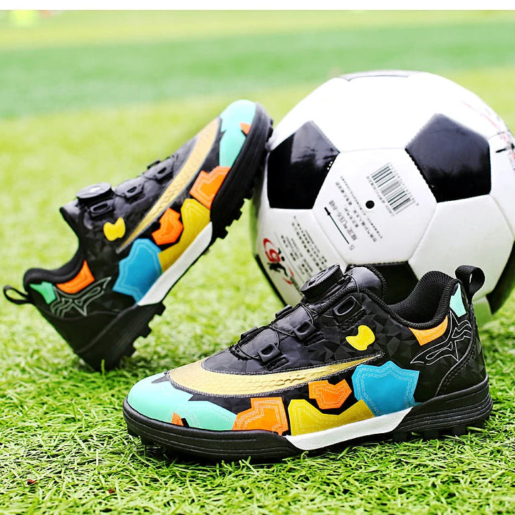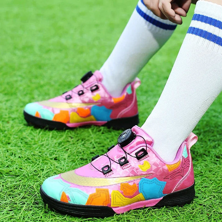Designed for young athletes, these indoor soccer training shoes feature an innovative auto-lace system for quick, secure fit adjustments. The non-slip rubber outsole provides excellent traction on indoor courts, while the breathable cotton upper keeps feet comfortable during intense play. Lightweight and responsive, these unisex shoes are perfect for developing skills and building confidence on the field. Ideal for training sessions and casual play.