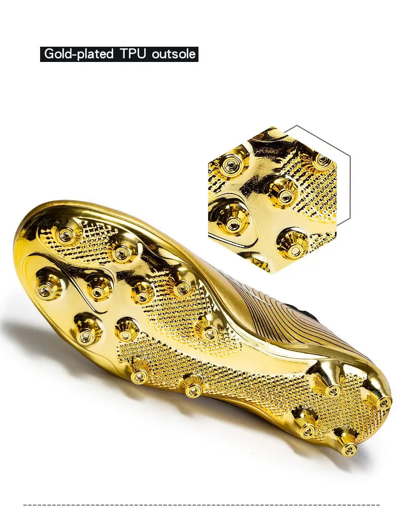 Step into greatness with these Golden Boots Cristiano Ronaldo-inspired soccer cleats, designed for young athletes who dream big. Crafted for kids and youth players, these cleats deliver exceptional performance on both indoor courts and firm ground fields. The striking golden finish captures the elegance of a champion, while the advanced sole technology ensures superior traction, stability, and comfort during intense matches and training sessions. Perfect for developing players who want to train like the pros and elevate their game to the next level.